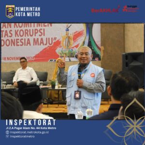 Kegiatan Sosialisasi Anti Korupsi bertempat di Ballroom Hotel Aidia Grande Metro, Senin (18/11/2024). Kegiatan tersebut dihadiri oleh kurang lebih 100 peserta yang berasal dari Staff Ahli dan OPD se-Kota Metro. Turut hadir pula Sekretaris Daerah Kota Metro, Ir. Bangkit Haryo Utomo, M.T., yang memberikan sambutan sekaligus membuka acara.