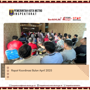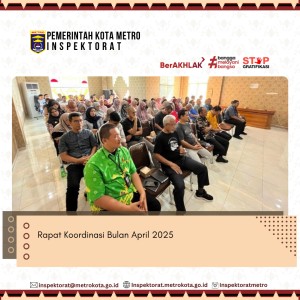 Rapat koordinasi bulan April berlangsung di Aula Inspektorat Kota Metro, Jumat (25/04/2025). Dipimpin oleh Plt. Inspektur kota Metro dan dihadiri oleh seluruh Irban serta Staff Pegawai pada Inspektorat Kota Metro.